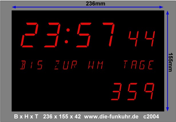 Diese Countdown Uhr entspricht unserer “normalen” Funkuhr vom Typ 7; sie ist aber so programmiert, dass sie bis zum Anpfiff der WM am 12.06.2014 um 18:00h entweder ständig, oder alle 10 Minuten im Wechsel mit der Uhrzeit die noch verbleibenden Tage, Stunden, Minuten und Sekunden anzeigt. Nach dem Countdown läuft sie als Funkuhr im Normalbetrieb weiter. Selbstverständlich ist der Countdown auch funkgenau. Der Countdown wird von der Uhr selbst berechnet